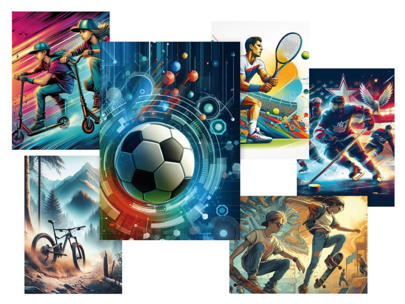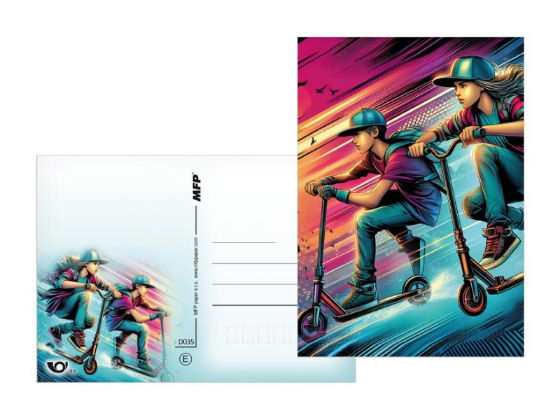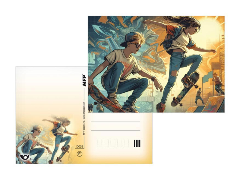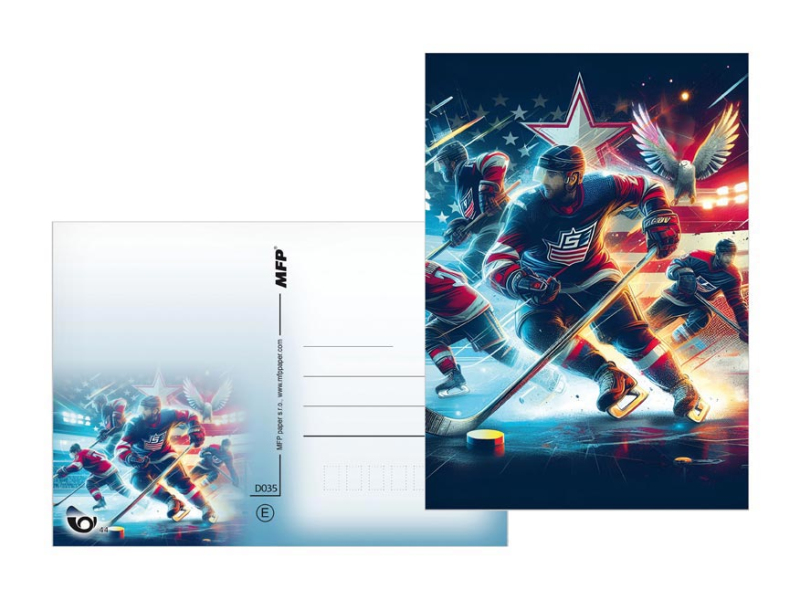Pohľadnica s motívmi rôznych športov. Pohľadnice sú bez textu na zadnej strane. Text: 0/6 Povrchová úprava: UV lak Papier: pohľadnicový kartón 240 g Dodávame v mixe po 6 ks podľa skladových zásob. Uvedená cena je za 1 ks.