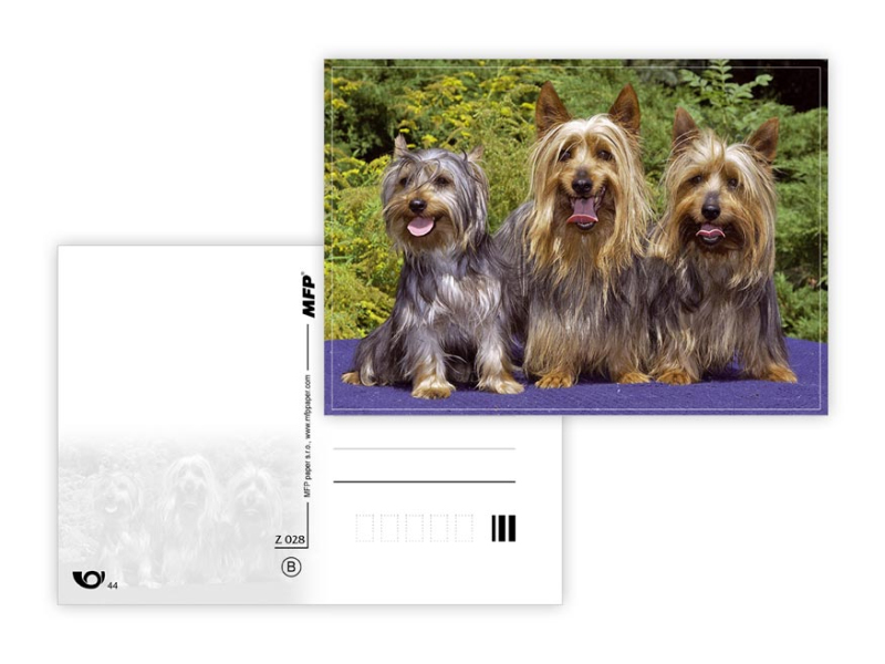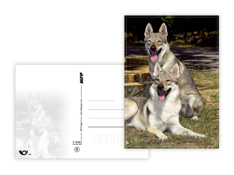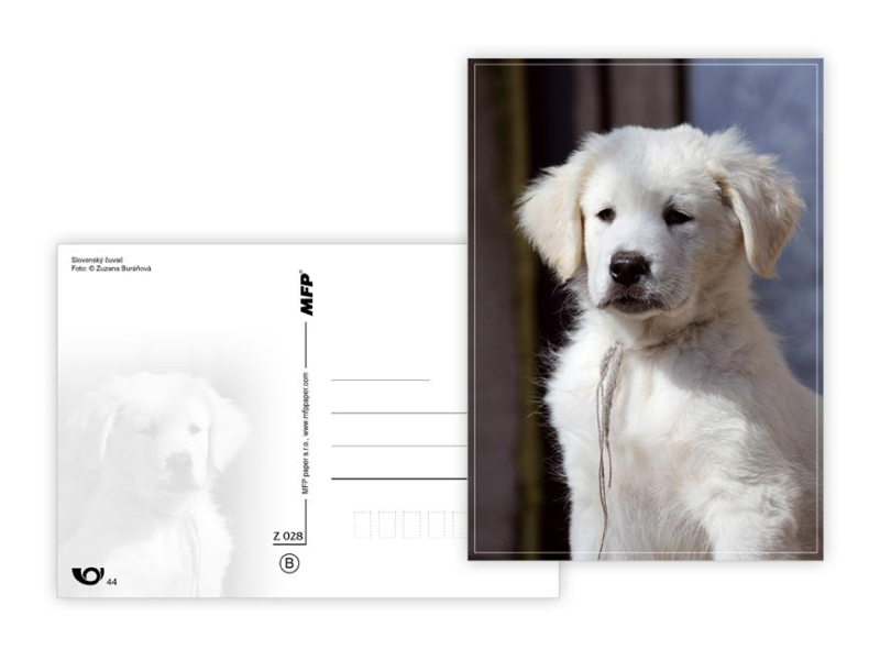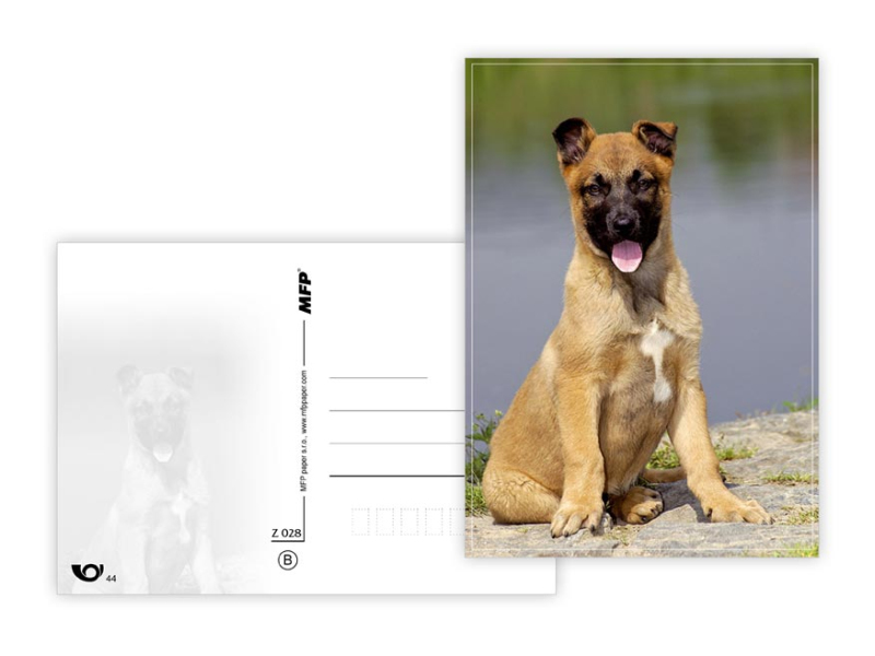 Pohľadnica s motívom zvierat. Nájdete tu obrázky rôznych plemien psov a šteniat. Dodávame v mixe podľa skladových zásob. Pohľadnice sú bez textu na zadnej strane. Uvedená cena je za 1 ks Rozmery: A6 10,5 x 14,8 cm Papier: pohľadnicový kartón 240 g Povrchová úprava: UV lak Text: 0/6