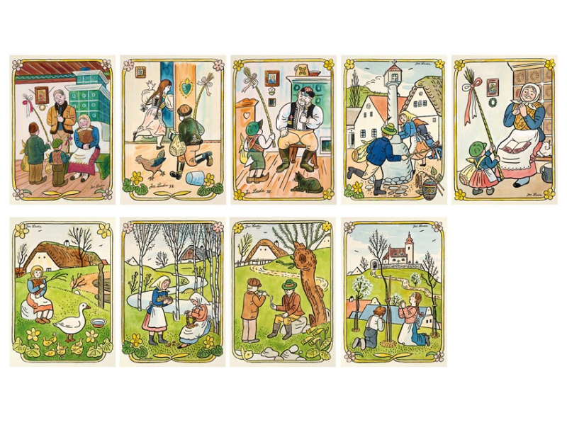 Veľkonočné pohľadnice s krásnou ilustráciou od Jozefa Ladu, ktorá znázorňuje tradície harmonického vidieka. Poprajte svojim blízkym krásne sviatky jari. Pohľady sú bez textu na zadnej strane. Text: 0/6 Papier: pohľadnicový kartón 300 g Dodávame v mixe 9 ks podľa skladovej zásoby. Uvedená cena je za 1 ks.