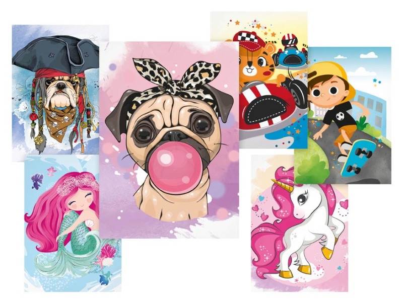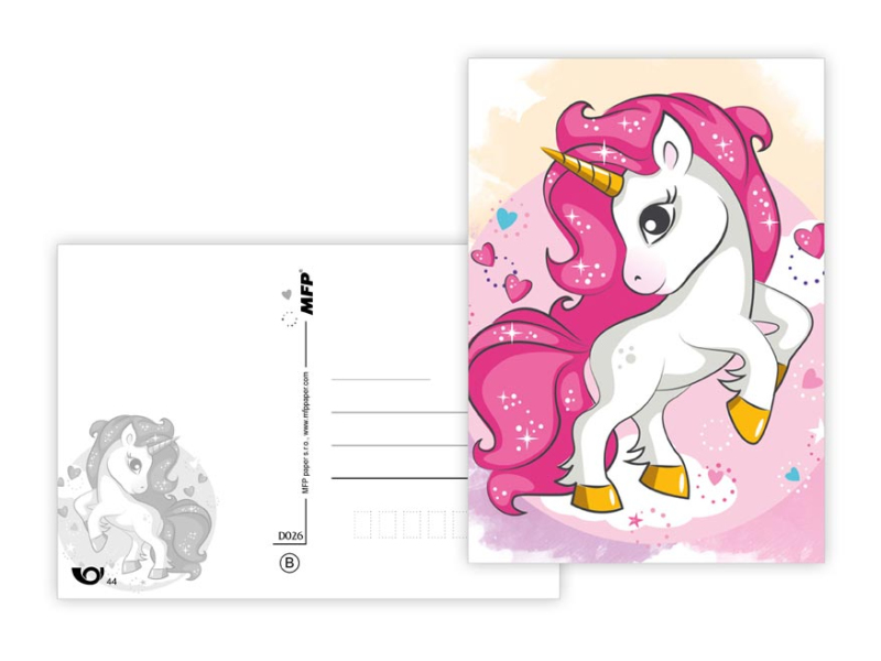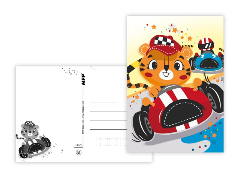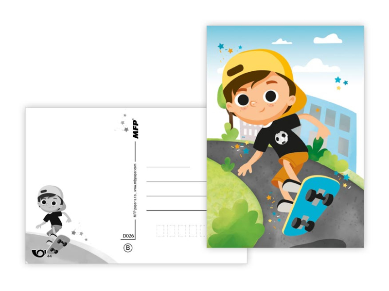Pohlednice s dětským motivem. Dodáváme v mixu podle skladové zásoby. Pohlednice jsou bez textu na zadní straně. Papír: pohlednicový karton 240 g Povrchová úprava: UV lak Text: bez textu Uvedená cena je za 1 ks.