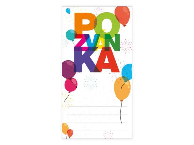 Pozvánka na narodeninovú oslavu a párty s obrázkom balónov. – Budeš mať narodeninovú párty a chceš pozvať kamarátov? Pošli im pozvánku na oslavu! Na pozvánke sú riadky, kde sa vypíše napr. meno, dátum a čas oslavy, miesto oslavy alebo menší odkaz. Uvedená cena je za 10 ks.