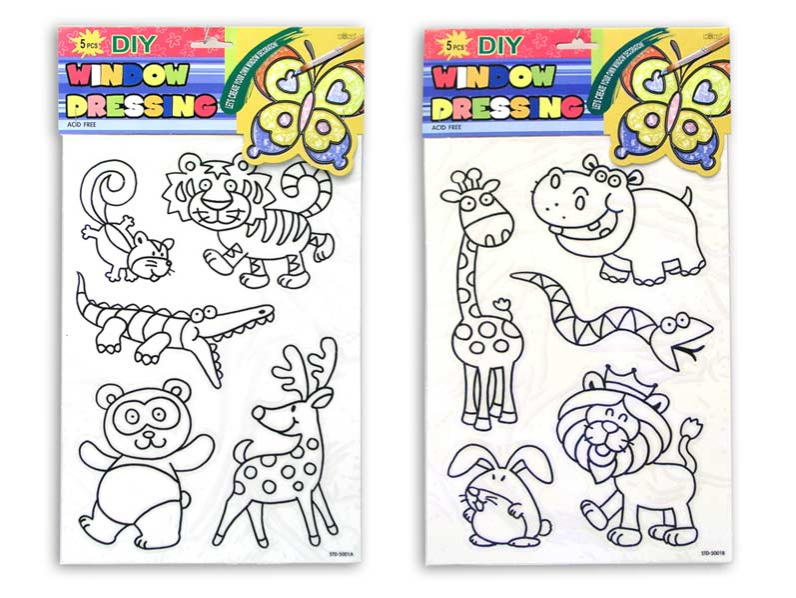 Predloha k farbičkám na sklo na adhéznu fóliu. Na predlohe sú obrázky zvierat. Obrázok sa po vyfarbení a uschnutí umiestni na čisté sklo alebo inú hladkú plochu. Obrázok elektrostaticky priľne.