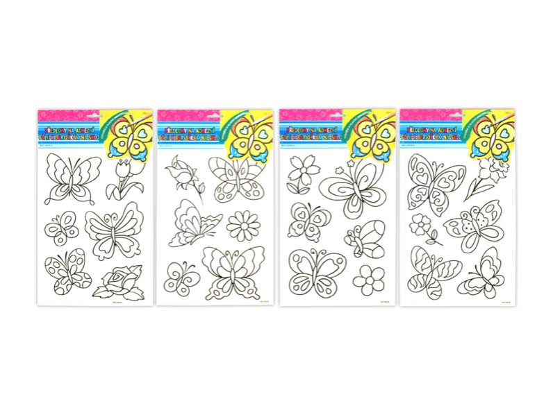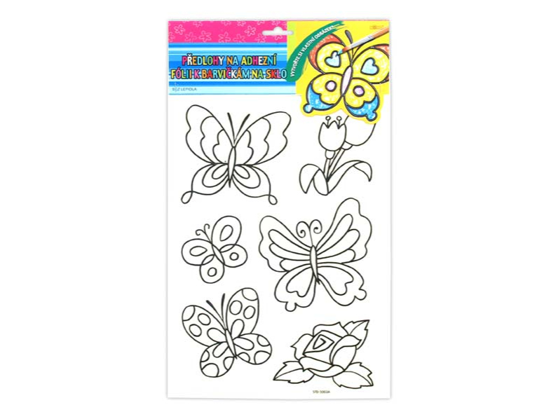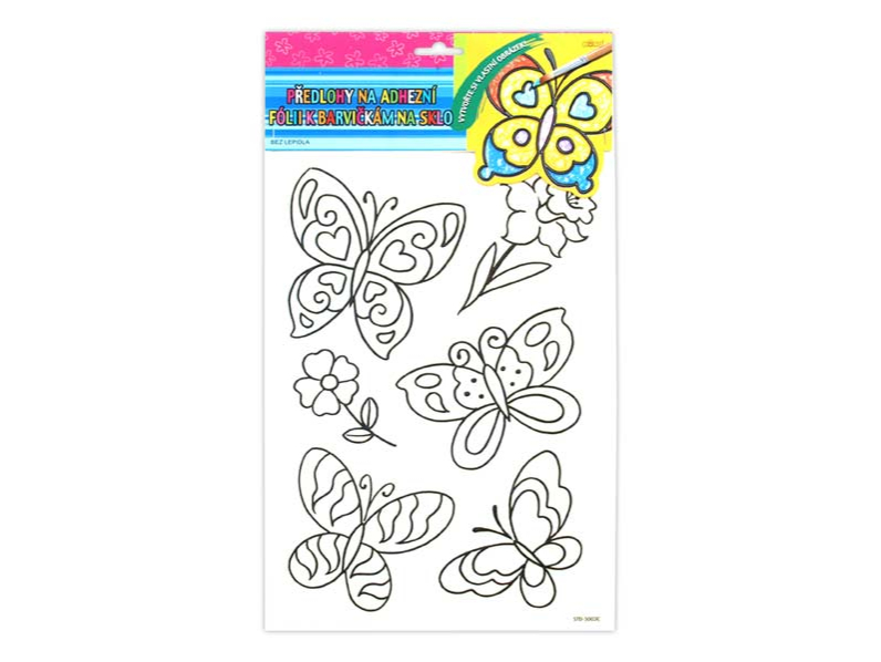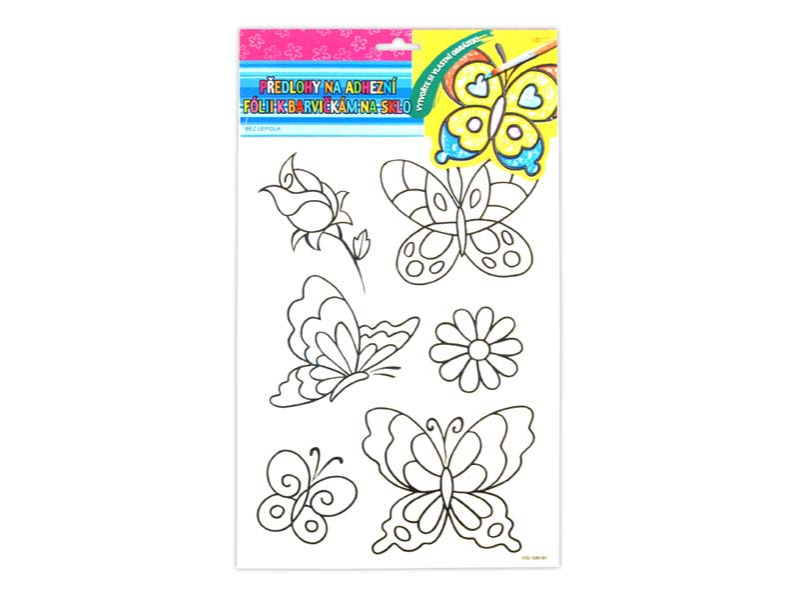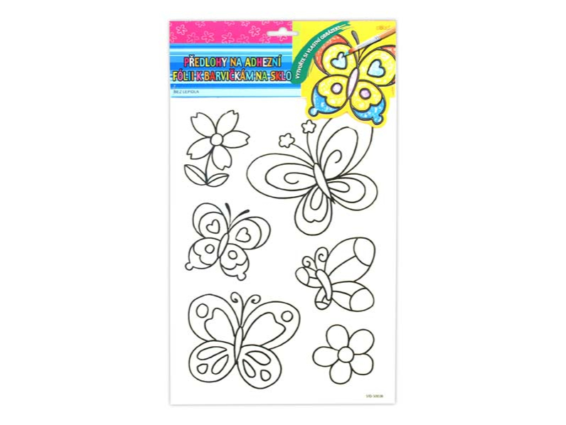 Predloha k farbičkám na sklo na adhéznu fóliu. Na predlohe sú obrázky motýľov a kvetín. Obrázok sa po vyfarbení a uschnutí umiestni na čisté sklo alebo inú hladkú plochu. Obrázok elektrostaticky priľne. Uvedená cena je za jedno balenie. Rozmery: 38x21cm