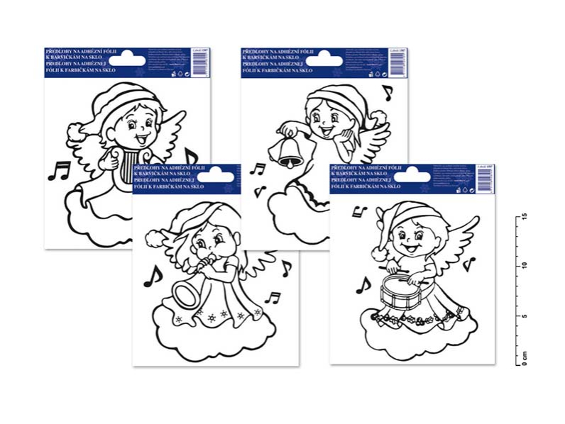 Predloha k farbičkám na sklo na adhéznu fóliu – Urobte si pohodové popoludnie s deťmi, prekreslite si obrázok pomocou týchto šablón, ktorý si potom môžete vystaviť na vaše okno. Produkcia: vianočný motív – anjeličkovia NÁVOD: Vyfarbite a po uschnutí umiestnite na čisté, prípadne navlhčené sklo, alebo na inú čistú a hladkú plochu. Obrázok elektrostaticky priľne. Môžete vyfarbiť farbičkami na sklo, fixkami, vodovými farbami a pod. Uvedená cena je za 1 ks. Dodávame v mixe po 4 ks podľa skladových zásob.