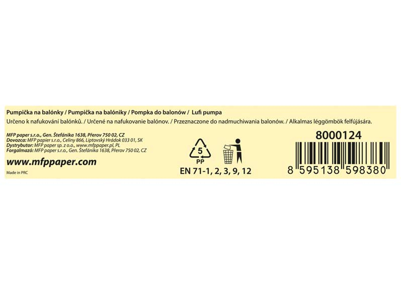 Plastová pumpička na nafukovacie balóniky. Urobte si parádnu párty výzdobu s nafukovacími balónikmi, čím viac balónikov, tým lepšie. Nebojte sa, nafukovanie bude hračka s jednoduchou, mechanickou pumpičkou. Varovanie: Nevhodné pre deti do 3 rokov. Deti sa môžu prasknutými či vyfúknutými balónikmi zadusiť alebo uškrtiť. Používajte iba pod dozorom dospelej osoby. Dospelá osoba sa po nafúknutí balónika musí presvedčiť, že ho deti používajú bezpečne. Vyfúknuté balóniky udržujte mimo dosahu detí a prasknuté ihneď zlikvidujte. Na nafukovanie balónikov použite pumpičku. Nepribližujte balóniky k očiam a tvári. Pri prasknutí môže balónik spôsobiť zranenie. Vyrobené z prírodného kaučuku, latexu. Určené na dekoratívne účely. Dodávame v mixe farieb. Uvedená cena je za 1 ks.
