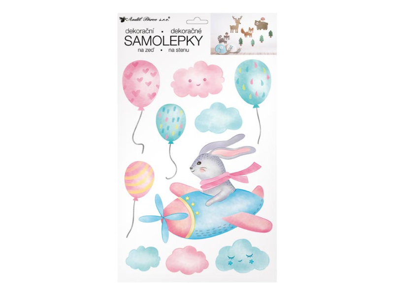 Samolepiaca dekorácia zajac v lietadle. Samolepky sú vhodné na steny, zrkadlá, kachličky a iné hladké plochy. NÁVOD: 1. Opatrne odoberte samolepku z podkladového papiera a umiestnite ju na zvolenú suchú a čistú plochu. 2. Vyhlaďte od stredu ku krajom Uvedená cena je za 1 hárok.