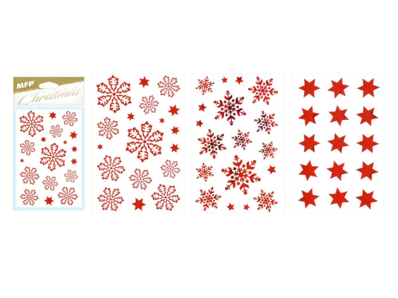 Vianočné samolepky, červené snehové vločky. Dekoračné samolepky vhodné na zdobenie darčekov, pohľadníc, okien, zrkadiel atď. Vytvoria čarovnú vianočnú atmosféru. Rozmer: 80 x 120 mm Motív: snehové vločky Farba: červená Dodávame v mixe po 3 kusoch podľa skladových zásob. Uvedená cena je za 1 hárok.