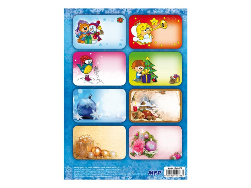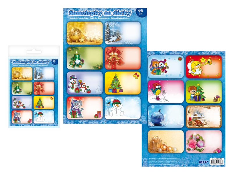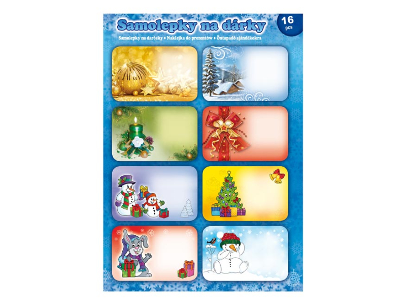 Samolepky na vianočné darčeky 16 ks. Balenie obsahuje dva hárky A5. Na každom hárku je 8 samolepiek. Všetko je balené vo vrecku s euro závesom. Rozmery hárkov: 210 x 148 mm