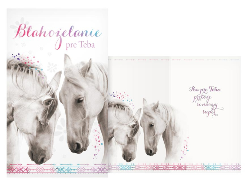 Blahoželanie detské. Krásne blahoželanie pre deti k narodeninám s obrázkom koní. Toto prianie urobí určite veľkú radosť každej malej slečne. Text na prednej strane: Blahoželanie pre Teba Text vo vnútri želania: Iba pre Teba, pretože si naozaj super. Papier: pohľadnicový kartón 240 g Želanie je balené vo vrecúšku, súčasťou je i listová obálka. Uvedená cena je za 1 ks.