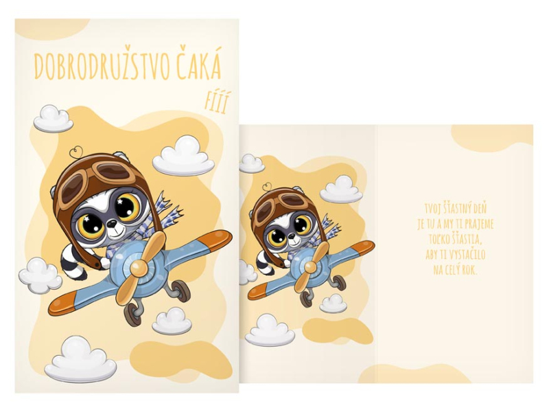 Blahoželanie detské. Krásne blahoželanie k narodeninám s obrázkom roztomilého mývala v lietadle. Určite urobí radosť všetkým deťom. Text na prednej strane: Dobrodružstvo čaká Text vo vnútri priania: Tvoj šťastný deň je tu a my Ti prajeme toľko šťastia, aby Ti vystačilo na celý rok. Papier: pohľadnicový kartón 240 g Prianie je balené v sáčku, súčasťou balenia je aj listová obálka. Uvedená cena je za 1 ks.