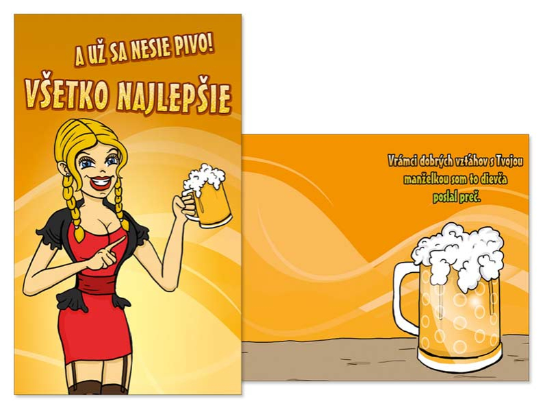 Srdečné blahoželanie k narodeninám. Potešte oslávenca a spolu s darčekom mu venujte originálne a krásne prianie, ktoré mu bude pripomínať túto radostnú udalosť. Text na prednej strane: A už sa nesie pivo! Všetko najlepšie! Text vo vnútri blahoželania: V rámci dobrých vzťahov s Tvojou manželkou som to dievča poslal preč. Rozmery: 114 x 190 mm Papier: pohľadnicový kartón 240 g Želanie ja balené vo vrecúšku, súčasťou balenia je listová obálka. Uvedená cena je za 1 ks.