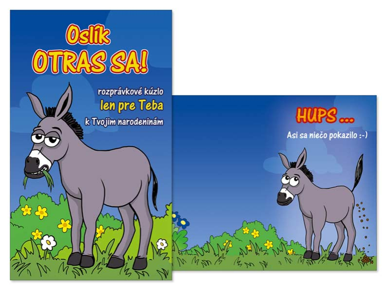 Srdečné blahoželanie k narodeninám. Potešte oslávenca a spolu s darčekom mu venujte originálne a krásne prianie, ktoré mu bude pripomínať túto radostnú udalosť. Text na prednej strane: Oslík, otras sa! Rozprávkové kúzlo len pre teba k Tvojim narodeninám Text vo vnútri blahoželania: HUPS ... Asi sa niečo pokazilo? Rozmery: 114 x 190 mm Papier: pohľadnicový kartón 240 g Želanie ja balené vo vrecúšku, súčasťou balenia je listová obálka. Uvedená cena je za 1 ks.