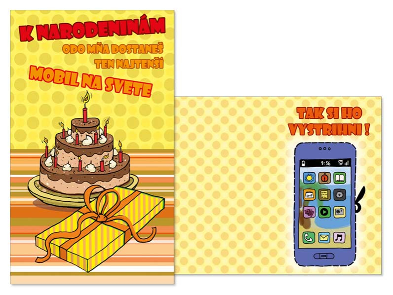 Srdečné blahoželanie k narodeninám. Potešte oslávenca a spolu s darčekom mu venujte originálne a krásne prianie, ktoré mu bude pripomínať túto radostnú udalosť. Text na prednej strane: K narodeninám odo mňa dostaneš ten najtenší mobil na svete Text vo vnútri blahoželania: Tak si ho vystrihni! Rozmery: 114 x 190 mm Papier: pohľadnicový kartón 240 g Želanie ja balené vo vrecúšku, súčasťou balenia je listová obálka. Uvedená cena je za 1 ks.