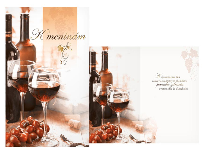 Blahoželanie k meninám. Krásne blahoželanie k meninám určite urobí oveľa väčšiu radosť ako obyčajná sms. Text na prednej strane blahoželania: K meninám Text vo vnútri blahoželania: K významnému dňu čo najviac radostných okamihov, pevného zdravia a optimizmu do ďalších dní. Papier: pohľadnicový kartón 240 g Blahoželanie je v obale, súčasťou balenia je aj listová obálka. Uvedená cena je za 1 ks.
