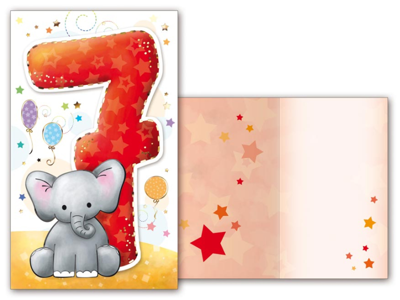 Detské blahoželanie k 7. narodeninám s obrázkom. Oslavy narodenín patria k výnimočným a príjemným okamžikom v živote. Potešte oslávenca a spolu s darčekom mu venujte aj originálne a krásne blahoželanie, ktoré mu bude pripomínať túto radostnú udalosť. Blahoželanie je s obrázkom slona. Text na prednej strane: 7 Text vo vnútri: Bez textu Papier: pohľadnicový kartón 240 g Blahoželanie je vo vrecúšku spolu s listovou obálkou. Uvedená cena je za 1 ks.