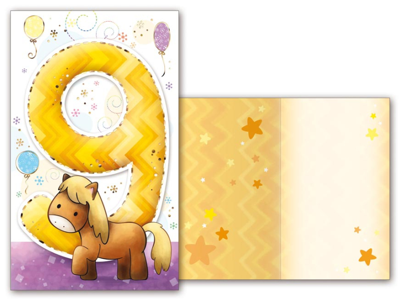 Detské blahoželanie k 9. narodeninám s obrázkom. Oslavy narodenín patria k výnimočným a príjemným okamžikom v živote. Potešte oslávenca a spolu s darčekom mu venujte aj originálne a krásne blahoželanie, ktoré mu bude pripomínať túto radostnú udalosť. Blahoželanie je s obrázkom koníka. Text na prednej strane: 9 Text vo vnútri: Bez textu Papier: pohľadnicový kartón 240 g Blahoželanie je vo vrecúšku spolu s listovou obálkou. Uvedená cena je za 1 ks.