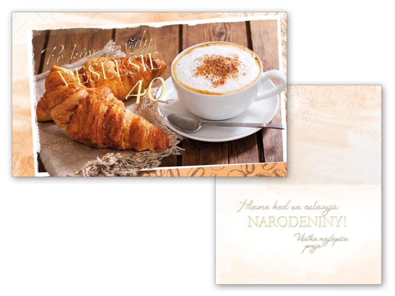 Srdečné blahoželanie k 40. narodeninám s textom. Nezabudnite k darčeku k narodeninám kúpiť aj pekné blahoželanie. Urobíte oslávencovi radosť. Text na prednej strane: Po káve je vždy VESELŠIE 40 Text vo vnútri: Hlavne, keď sa oslavujú NARODENINY! Všetko najlepšie praje Papier: pohľadnicový kartón 240 g Blahoželanie je zabalené, súčasťou balenia je aj listová obálka. Uvedená cena je za 1 ks.