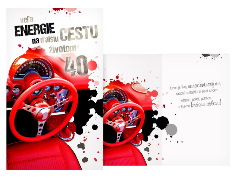 Blahoželanie k 40. narodeninám s textom. Krásne prianie s obrázkom volantu. Určite toto prianie poteší oslávenca a bude mu pripomínať túto radostnú udalosť. Text na prednej strane: vel'a ENERGIE na ďalšiu CESTU životom 40 Text vo vnútri priania: Dnes je Tvoj narodeninový deň, radosť a šťastie Ti želať chcem. Zdravie, pokoj, pohodu a hlavne krásnu oslavu! Papier: pohľadnicový kartón 240 g Želanie je balené vo vrecúšku, súčasťou je aj obálka. Uvedená cena je za 1 ks.