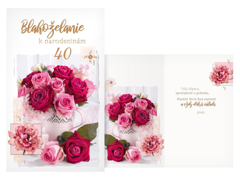 Blahoželanie k 40. narodeninám s obrázkom kytice ruží. Oslavy narodenín patria k výnimočným a príjemným okamihom v živote. Potešte oslávenca a spolu s darčekom mu venujte originálne a krásne prianie, ktoré mu bude pripomínať túto radostnú udalosť. Text na prednej strane: Blahoželanie k narodeninám 40 Text vo vnútri priania: Veľa šťastia, pevné zdravie, spokojnosť a pohodu, šťastný život bez starostí a vždy dobrú náladu praje Papier: pohľadnicový kartón Prianie je balené v sáčku, súčasťou balenia je aj listová obálka. Uvedená cena je za 1 ks.
