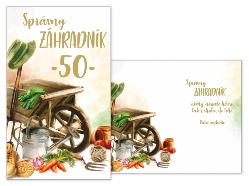 Blahoželanie k 50. narodeninám. Nezabudnite si k darčeku zakúpiť aj pekné blahoželanie. Určite urobíte veľkú radosť oslávencovi. Blahoželanie je s obrázkom náradia do záhrady. Text na prednej strane blahoželania: Správny záhradník 50 Text vo vnútri blahoželania:: Správny záhradník nepovie nikdy hotovo, tak len s chuťou do toho. Všetko najlepšie! Papier: pohľadnicový kartón 240 g Blahoželanie je zabalené, súčasťou balenia je aj listová obálka.