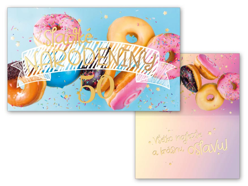 Srdečné blahoželanie k 50. narodeninám s textom. Nezabudnite k darčeku k narodeninám kúpiť aj pekné blahoželanie. Určite urobíte oslávencovi veľkú radosť. Text na prednej strane: Sladké narodeniny Text vo vnútri: Všetko najlepšie a krásnu oslavu Papier: pohľadnicový kartón 240 g Blahoželanie je zabalené, súčasťou balenia je aj listová obálka. Uvedená cena je za 1 ks.