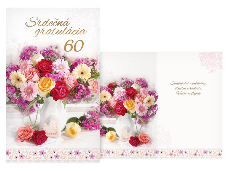Blahoželanie k 60. narodeninám s textom. Blahoželanie je s obrázkom kytice kvetov. Oslavy narodenín patria k výnimočným a príjemným okamihom v živote. Potešte oslávenca a spolu s darčekom mu venujte originálne a krásne prianie, ktoré mu bude pripomínať túto radostnú udalosť. Text na prednej strane blahoželania: Srdečná gratulácia 60 Text vo vnútri blahoželania: Slnečné dni, plné lásky, šťastia a radosti. Všetko najlepšie Papier: pohľadnicový kartón 240 g Blahoželanie je v obale, súčasťou balenia je aj listová obálka. Uvedená cena je za 1 ks.