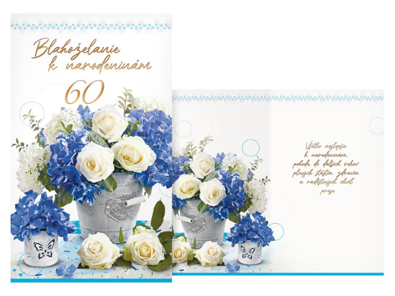 Blahoželanie k 60. narodeninám s textom. Blahoželanie je s obrázkom kvetín. Oslavy narodenín patria k výnimočným a príjemným okamihom v živote. Potešte oslávenca a spolu s darčekom mu venujte originálne a krásne prianie, ktoré mu bude pripomínať túto radostnú udalosť. Text na prednej strane blahoželania: Blahoželanie k narozeninám 60 Text vo vnútri blahoželania: Všetko najlepšie k narodeninám, pohodu do ďalších rokov plných šťastia, zdravia a radostných chvíľ praje Papier: pohľadnicový kartón 240 g Blahoželanie je v obale, súčasťou balenia je aj listová obálka. Uvedená cena je za 1 ks.