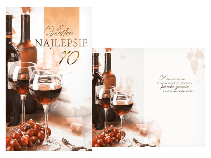 Blahoželanie k 70. narodeninám. Krásne prianie k narodeninám určite urobí oveľa väčšiu radosť ako obyčajná sms. Text na prednej strane blahoželania: Všetko najlepšie 70 Text vo vnútri blahoželania: K významnému dňu čo najviac radostných okamihov, pevného zdravia a optimizmu do ďalších dní. Papier: pohľadnicový kartón 240 g Blahoželanie je v obale, súčasťou balenia je aj listová obálka. Uvedená cena je za 1 ks.