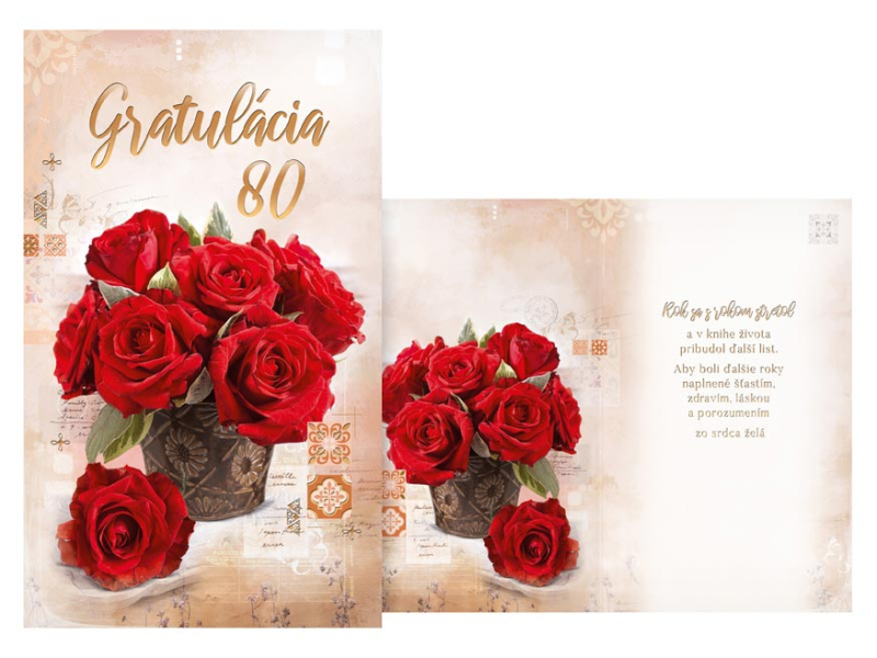 Blahoželanie k 80. narodeninám s textom. Blahoželanie je s obrázkom červených ruží. Oslavy narodenín patria k výnimočným a príjemným okamihom v živote. Potešte oslávenca a spolu s darčekom mu venujte originálne a krásne prianie, ktoré mu bude pripomínať túto radostnú udalosť. Text na prednej strane blahoželania: Gratulácia 80 Text vo vnútri blahoželania: Rok sa s rokom stretol a v knihe života pribudol ďalší list. Aby boli ďalšie roky naplnené šťastím, zdravím, láskou a porozumením zo srdca želá Papier: pohľadnicový kartón 240 g Blahoželanie je v obale, súčasťou balenia je aj listová obálka. Uvedená cena je za 1 ks.