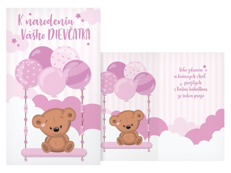 Blahoželanie k narodeniu bábätka. Krásne blahoželanie k narodeniu bábätka s obrázkom medvedíka sediaceho na hojdačke s balónikmi pre malé dievčatko. Prianie, ktoré urobí radosť a bude sa určite páčiť. Text na prednej strane: K narodeniu Vášho DIEVČATKA Text vo vnútri priania: Veľa zdravia a krásnych chvíľ prežitých s Vašim bábätkom zo srdca praje Papier: pohľadnicový kartón 240 g Prianie je balené v sáčku, súčasťou balenia je aj listová obálka. Uvedená cena je za 1 ks.