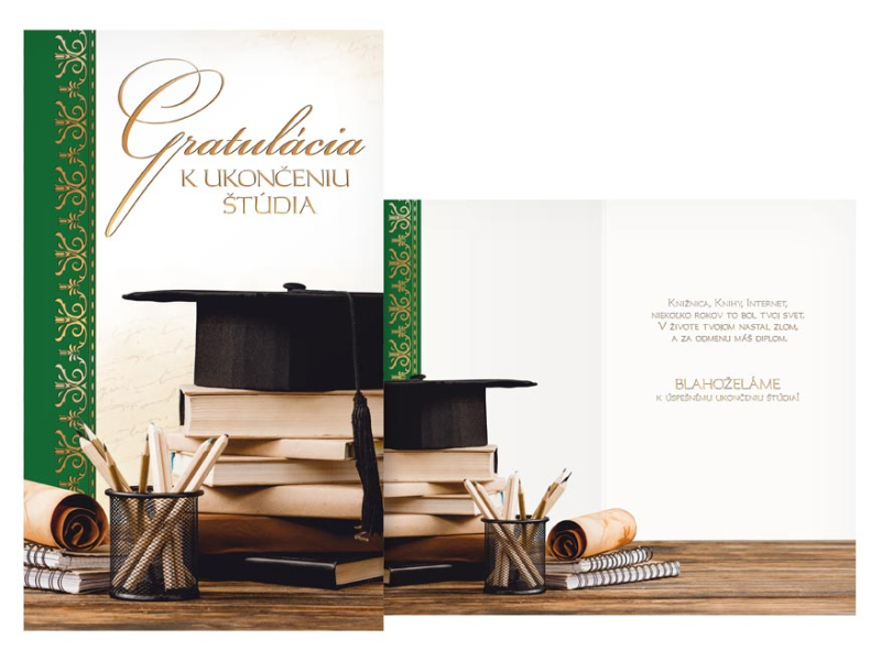 Blahoželanie k ukončenie štúdia s textom. Oslavy ukončenia štúdia patria k výnimočným a príjemným okamihom v živote. Venujte originálne a krásne prianie, ktoré bude pripomínať tento životný míľnik. Text na prednej strane blahoželania: Gratulácia K UKONČENÍ ŠTÚDIA Text vo vnútri blahoželania: Knižnica, knihy, internet, na pár rôčkov to bol Tvoj svet. V živote Tvojom však nastal zlom, zajtra si pôjdeš po diplom. BLAHOŽELÁME k úspešnému ukončeniu štúdia! Papier: pohľadnicový kartón 240 g Prianie je balené v sáčku, súčasťou balenia je aj listová obálka. Uvedená cena je za 1 ks.