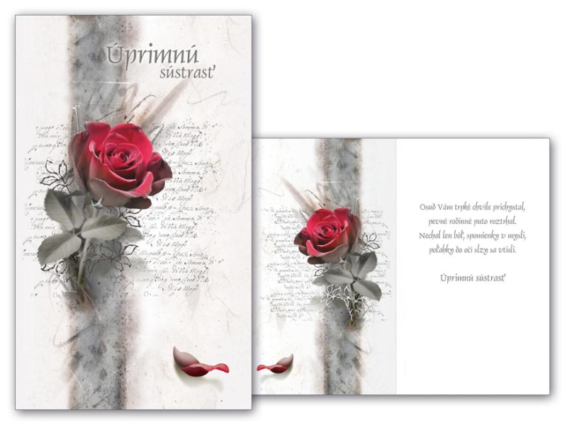 Vyjadrenie sústrasti, kondolencie s textom. Úmrtie blízkej osoby je vždy tragická udalosť. Vyjadrite kondolenciou úprimnú sústrasť a súcit pozostalým. Kondolenčný prejav a smútočné kvetiny vám zaistia dôstojné rozlúčenie s vaším blízkym človekom.. Text na prednej strane: Úprimnú sústrasť Text vo vnútri blahoželania: Osud Vám trpké chvíle prichystal, pevné rodinné puto roztrhal. Nechal len bôľ, spomienky v mysli, poľahky do očí slzy sa vtisli. Úprimnú sústrasť Papier: pohľadnicový kartón 240 g Želanie ja balené vo vrecúšku, súčasťou balenia je listová obálka. Uvedená cena je za 1 ks.