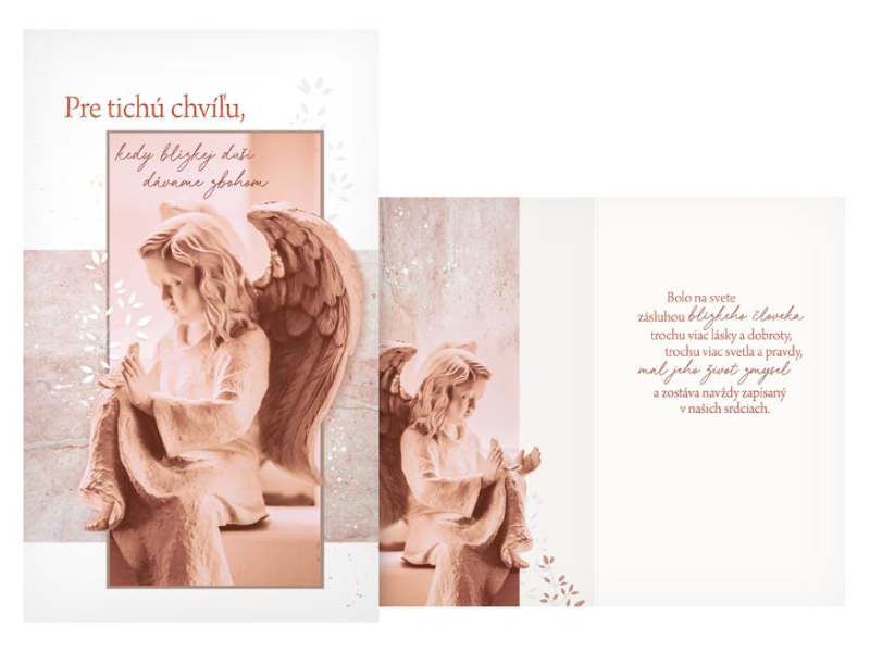 Vyjadrenie sústrasti, kondolencie s textom. Úmrtie blízkej osoby je vždy tragická udalosť. Vyjadrite kondolenciou úprimnú sústrasť a súcit pozostalým. Kondolenčný prejav a smútočné kvetiny vám zaistia dôstojné rozlúčenie s vaším blízkym človekom.. Text na prednej strane: Pre tichú chvíľu, kedy blízkej duši dáváme zbohom Text vo vnútri blahoželania: Bolo na svete zásluhou blízkeho človeka trochu viac lásky a dobroty, trochu viac svetla a pravdy, mal jeho život zmysel a zostáva navždy zapísaný v našich srdciach. Papier: pohľadnicový kartón 240 g Želanie ja balené vo vrecúšku, súčasťou balenia je listová obálka. Uvedená cena je za 1 ks.