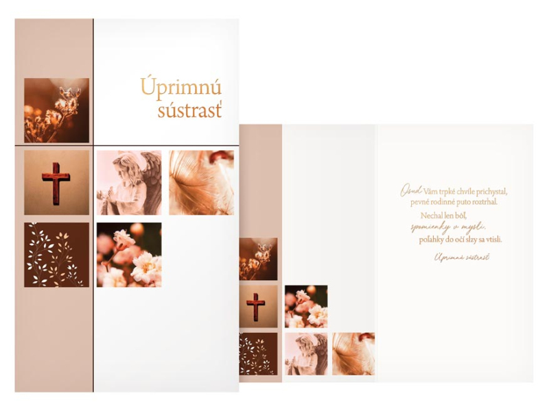 Vyjadrenie sústrasti, kondolencie s textom. Úmrtie blízkej osoby je vždy tragická udalosť. Vyjadrite kondolenciou úprimnú sústrasť a súcit pozostalým. Kondolenčný prejav a smútočné kvetiny vám zaistia dôstojné rozlúčenie s vaším blízkym človekom.. Text na prednej strane: Úprimnú sústrasť Text vo vnútri blahoželania: Osud Vám trpké chvíle prichystal, pevné rodinné puto roztrhal. Nechal len bôľ, spomienky v mysli, poľahky do očí slzy sa vtisli. Úprimnú sústrasť Papier: pohľadnicový kartón 240 g Želanie ja balené vo vrecúšku, súčasťou balenia je listová obálka. Uvedená cena je za 1 ks.