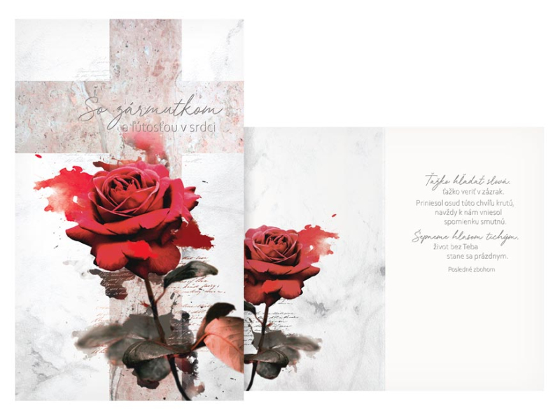 Vyjadrenie sústrasti, kondolencie s textom. Úmrtie blízkej osoby je vždy tragická udalosť. Vyjadrite kondolenciou úprimnú sústrasť a súcit pozostalým. Kondolenčný prejav a smútočné kvetiny vám zaistia dôstojné rozlúčenie s vaším blízkym človekom.. Text na prednej strane: So zármutkom a lútosťou v srdci Text vo vnútri blahoželania: Ťažko hľadať slová, ťažko veriť v zázrak. Priniesol osud túto chvíľu krutú, navždy k nám vniesol spomienku smutnú. Šepneme hlasom tichým, život bez Teba stane sa prázdnym. Posledné zbohom Papier: pohľadnicový kartón 240 g Želanie ja balené vo vrecúšku, súčasťou balenia je listová obálka. Uvedená cena je za 1 ks.