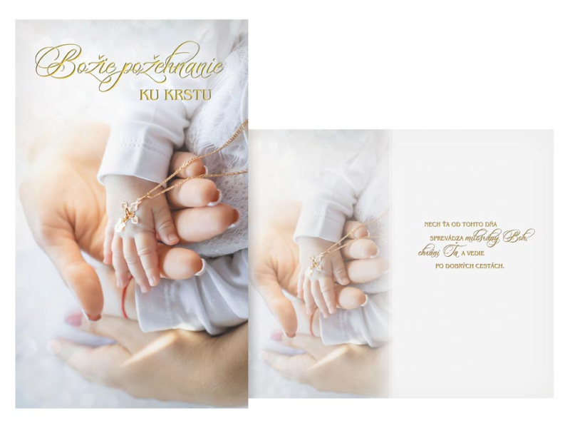 Blahoželanie ku krstu. Krst je pre dieťatko aj jeho najbližší dôležitým životným míľnikom. Spolu s darčekom venujte na pamiatku toto krásne blahoželanie. Text na prednej strane blahoželania: Božie požehnanie KU KRSTU Text vo vnútri blahoželania: Nech ťa od tohto dňa sprevádza milosrdný Boh, chráni Ťa a vedie po dobrých cestách. Papier: pohľadnicový kartón 240 g Želanie ja balené vo vrecúšku, súčasťou balenia je listová obálka. Uvedená cena je za 1 ks.