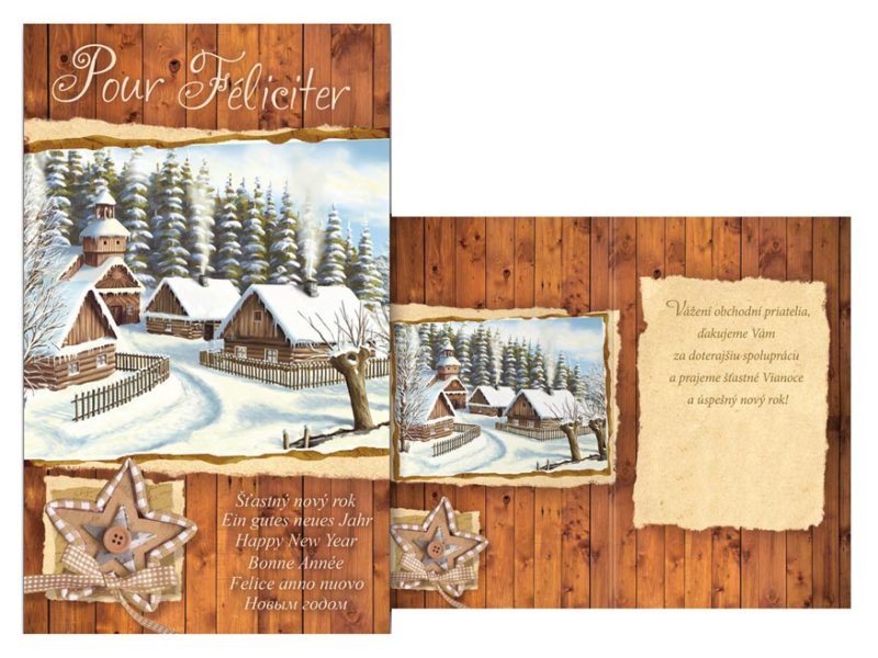 Bahoželanie novoročné s textom. Nezabudnite popriať obchodným partnerom, zákazníkom i dodávateľom všetko najlepšie do nového roka. Zaiste ich poteší, že ste si na ne spomenuli. Text na prednej strane: Pour Féliciter Šťastný nový rok Ein gutes neues Jahr Happy New Year Bonne Année Felice anno nuovo Text vo vnútri priania: Vážení obchodní priatelia, ďakujeme Vám za doterajšiu spoluprácu a prajeme šťastné Vianoce a úspešný nový rok Papier: pohľadnicový kartón 240 g Súčasťou želania je aj obálka. Uvedená cena je za 1 ks.