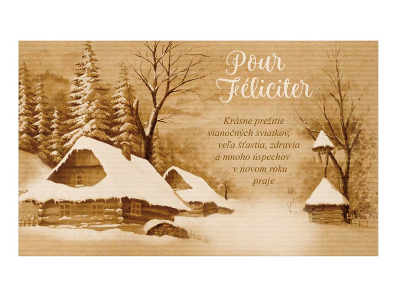Novoročné prianie. Nezabudnite popriať známym do nového roka. Zaiste ich poteší, že ste si na ne spomenuli. Text na prednej strane: Pour Féliciter Krásné prežitie vianočných sviatkov, ve'la šťastia, zdravia a mnoho úspechov v novom roku praje Papier: pohľadnicový kartón 240 g Prianie je balené v sáčku, súčasťou balenia je aj listová obálka. Uvedená cena je za 1 ks.