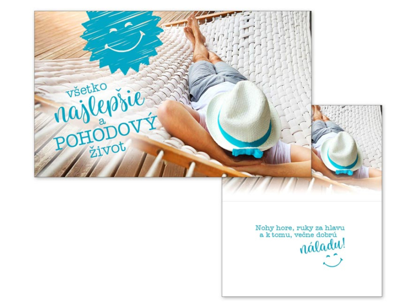 Srdečné blahoželanie k narodeninám, meninám alebo inej príležitosti s obrázkom muža v hojdacej sieti. Text na prednej strane blahoželania: Všetko najlepšie a pohodový život Text vo vnútri blahoželania: Nohy hore, ruky za hlavu a k tomu večne dobrú náladu! Papier: pohľadnicový kartón 240 g Blahoželanie je zabalené, súčasťou balenia je i listová obálka. Uvedená cena je za 1 ks.