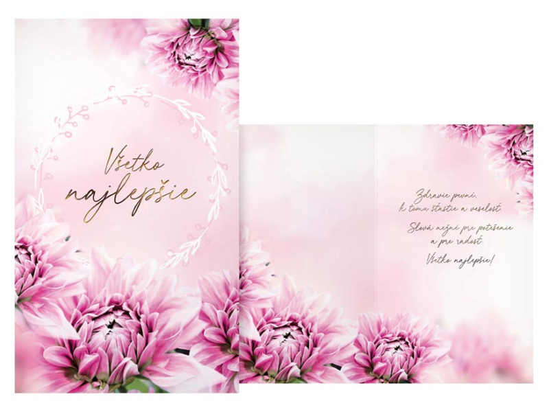 Blahoželanie srdečné s textom. Krásne prianie k narodeninám, sviatku alebo k iným príležitostiam s obrázkom kvetín, určite urobí oveľa väčšiu radosť ako obyčajná sms. Text na prednej strane blahoželania: Všetko najlepšie Text vo vnútri blahoželania: Zdravie pevné, k tomu šťastie a veselosť. Slová nežné pre potešenie a pre radosť. Všetko najlepšie! Papier: pohľadnicový kartón 240 g Blahoželanie je v obale, súčasťou balenia je aj listová obálka. Uvedená cena je za 1 ks.
