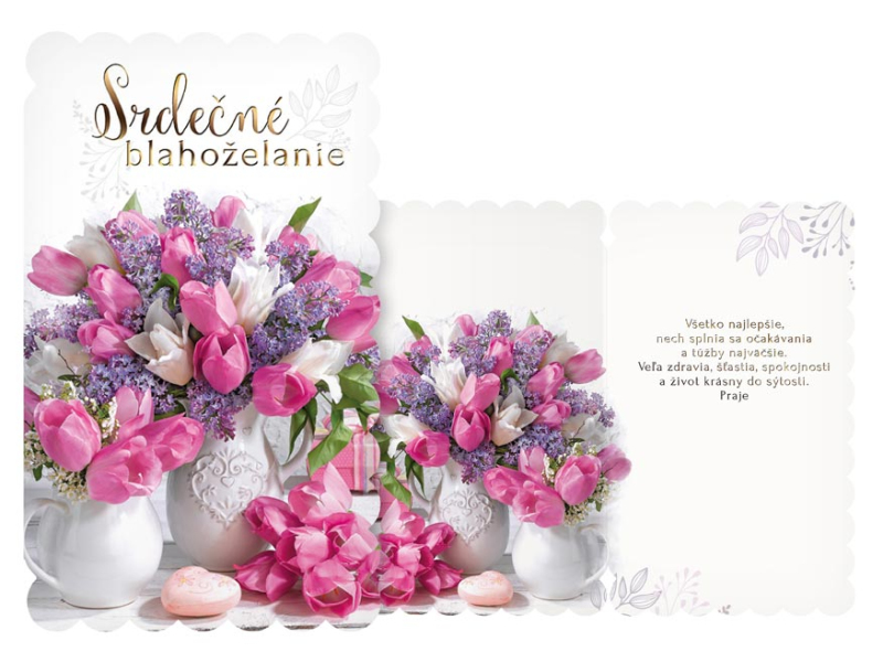 Srdečné blahoželanie k narodeninám s obrázkom kytice kvetín. Oslavy narodenín patria k výnimočným a príjemným okamihom v živote. Potešte oslávenca a spolu s darčekom mu venujte originálne a krásne prianie, ktoré mu bude pripomínať túto radostnú udalosť. Text na prednej strane: Srdečné blahoželanie Text vo vnútri priania: Všetko najlepšie, nech splnia sa očakávania a túžby najväčšie. Veľa zdravia, šťastia, spokojnosti a život krásny do sýtosti. Praje Papier: pohľadnicový kartón Prianie je balené v sáčku, súčasťou balenia je aj listová obálka. Uvedená cena je za 1 ks.