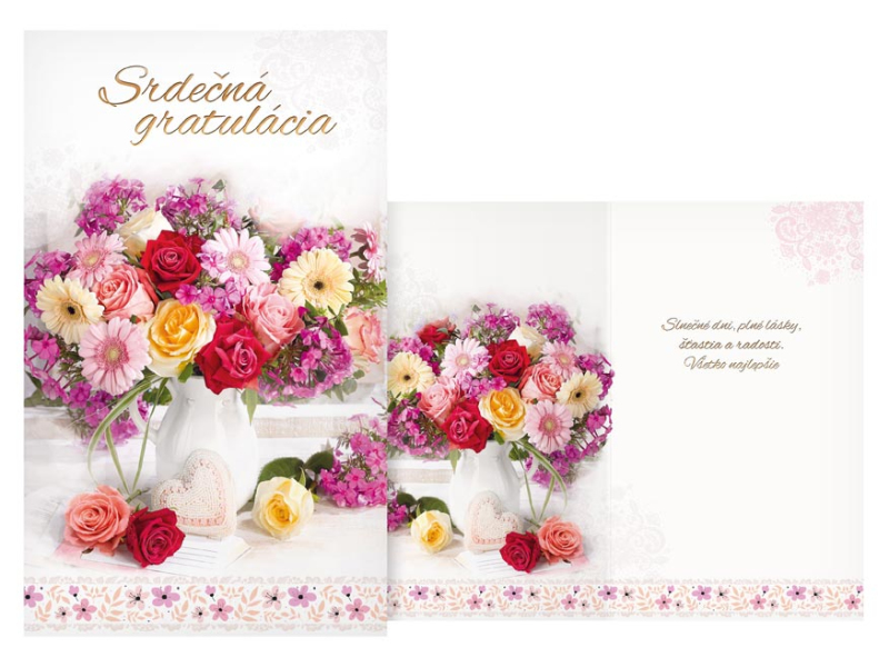 Blahoželanie srdečné. Krásne blahoželanie k narodeninám alebo k sviatku s obrázkom kytice kvetov, určite urobí oveľa väčšiu radosť ako obyčajná sms. Text na prednej strane: Srdečná gratulácia Text vo vnútri priania: Slnečné dni, plné lásky, šťastia a radosti. Všetko najlepšie Papier: pohľadnicový kartón 240 g Prianie je balené v sáčku, súčasťou balenia je aj listová obálka. Uvedená cena je za 1 ks.
