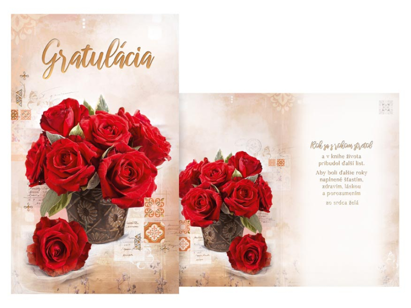 Sredčné blahoželanie k narodeninám. Oslavy narodenín patria k výnimočným a príjemným okamihom v živote. Potešte oslávenca a spolu s darčekom mu venujte originálne a krásne blahoželanie, ktoré mu bude pripomínať túto radostnú udalosť. Text na prednej strane: Gratulácia Text vo vnútri priania: Rok sa s rokom stretol a v knihe života pribudol ďalší list. Aby boli ďalšie roky naplnené šťastím, zdravím, láskou a porozumením zo srdca želá Papier: pohľadnicový kartón 240 g Prianie je balené v sáčku, súčasťou balenia je aj listová obálka. Uvedená cena je za 1 ks.