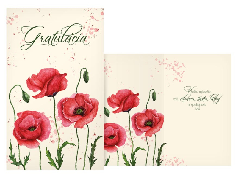 Srdečné blahoželanie k narodeninám alebo meninám s obrázkom vlčích makov. Potešte oslávenca a venujte mu srdečné blahoželanie Text na prednej strane blahoželania: Gratulácia Text vo vnútri blahoželania: Všetko najlepšie, veľa zdravia, šťastia, lásky a spokojnosti želá Papier: pohľadnicový kartón 240 g Blahoželanie je v obale, súčasťou balenia je i listová obálka. Uvedená cena je za 1 ks.