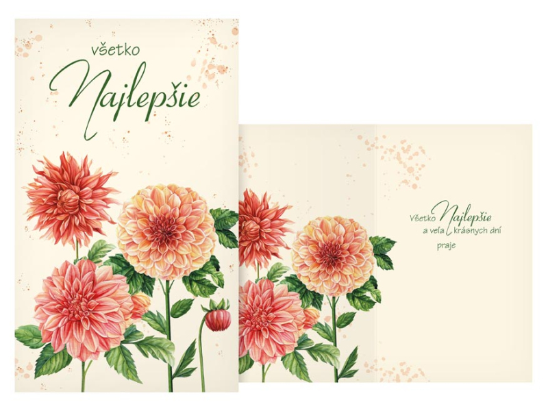 Srdečné blahoželanie k narodeninám alebo meninám s obrázkom georgín. Potešte oslávenca a venujte mu srdečné blahoželanie. Text na prednej strane blahoželania: všetko Najlepšie Text vo vnútri blahoželania: Všetko najlepšie a veľa krásnych dní praje Papier: pohľadnicový kartón 240 g Blahoželanie je v obale, súčasťou balenia je i listová obálka. Uvedená cena je za 1 ks.