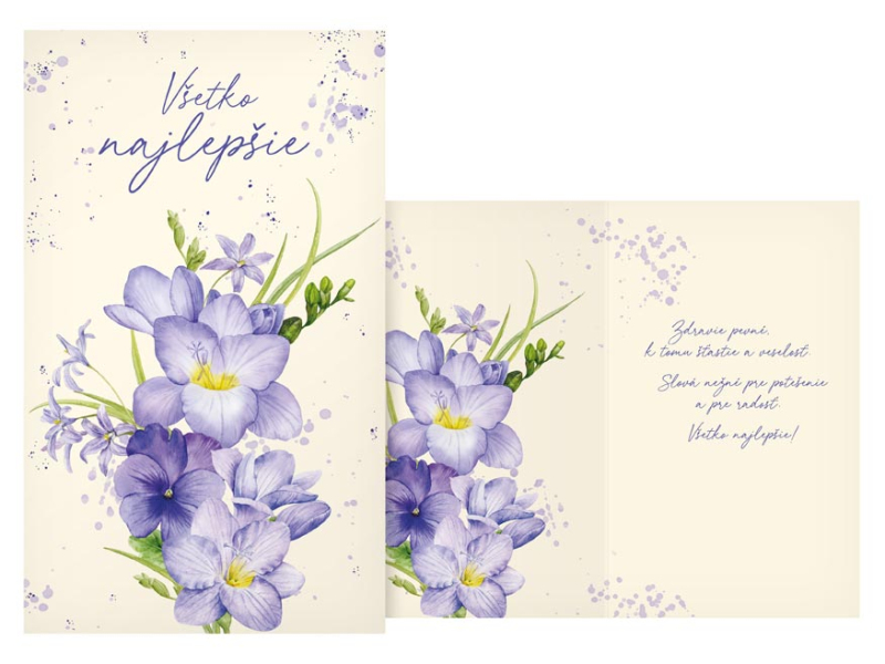 Srdečné blahoželanie k narodeninám alebo meninám s obrázkom kvetín. Potešte oslávenca a venujte mu srdečné blahoželanie. Text na prednej strane blahoželania: Všetko najlepšie Text vo vnútri blahoželania: Zdravie pevné, k tomu šťastie a veselosť. Slová nežné pre potešenie a pre radosť. Všetko najlepšie! Papier: pohľadnicový kartón 240 g Blahoželanie je v obale, súčasťou balenia je i listová obálka. Uvedená cena je za 1 ks.