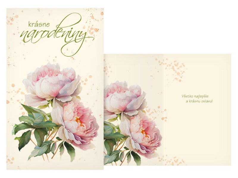 Blahoželanie srdečné k narodeninám s obrázkom pivoniek. Oslavy narodenín patria k výnimočným a príjemným okamihom v živote. Potešte oslávenca a spolu s darčekom mu venujte originálne a krásne prianie, ktoré mu bude pripomínať túto radostnú udalosť. Text na prednej strane: krásne narodeniny Text vo vnútri priania: Všetko najlepšie a krásnu oslavu! Papier: pohľadnicový kartón Prianie je balené v sáčku, súčasťou balenia je aj listová obálka. Uvedená cena je za 1 ks.