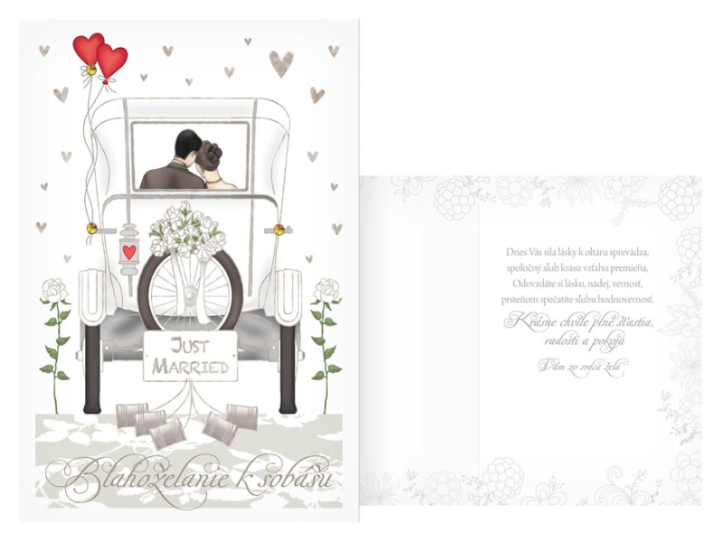 Svadobné blahoželanie. Urobte radosť novomanželom a venujte im blahoželanie k ich zväzku, vďaka ktorému si vždy pripomenú krásne začiatky ich manželstva. Text na prednej strane blahoželania: JUST MARRIED Blahoželanie k sobášu Text vo vnútri blahoželania: Dnes Vás síla lásky k oltáru sprevádza, spoločný sl'ub krásu premieňa. Odovzdáte si lásku, nádej, vernosť, prsteňom spečatite sl'ubu hodnovernosť. Krásne chvíle plné šťastia, radosti a pokoja Vám zo srdca želá Papier: pohľadnicový kartón 240 g Želanie ja balené vo vrecúšku, súčasťou balenia je listová obálka. Uvedená cena je za 1 ks.