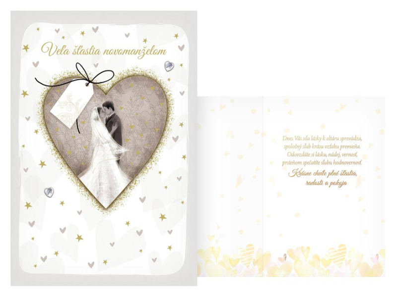 Svadobné blahoželanie. Urobte radosť novomanželom a venujte im blahoželanie k ich zväzku, vďaka ktorému si vždy pripomenú krásne začiatky ich manželstva. Text na prednej strane blahoželania: Vel'a šťastia Novomanželom Text vo vnútri blahoželania: Dnes Vás sila lásky k oltáru sprevádza, spoločný sl'ub krásu vzťahu premieňa. Odovzdáte si lásku, nádej, vernosť, prsteňom spečatíte slübu hodnovernosť. Krásne chvíle plné šťastia, radosti a pokoja Papier: pohľadnicový kartón 240 g Želanie ja balené vo vrecúšku, súčasťou balenia je listová obálka. Uvedená cena je za 1 ks.