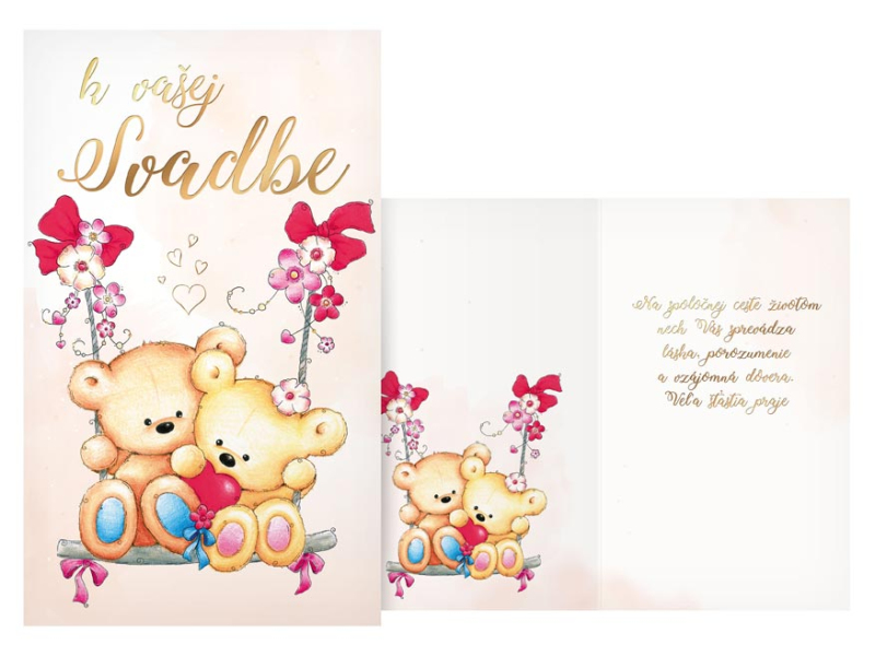 Svadobné blahoželanie s textom. Urobte radosť novomanželom a venujte im blahoželanie k ich zväzku, vďaka ktorému si vždy pripomenú krásne začiatky ich manželstva. Text na prednej strane blahoželania: k vašej Svadbe Text vo vnútri blahoželania: Na spoločnej ceste životom nech Vás sprevádza láska, porozumenie a vzájomná dôvera. Veĺa štastia praje Papier: pohľadnicový kartón 240 g Želanie ja balené vo vrecúšku, súčasťou balenia je listová obálka. Uvedená cena je za 1 ks.